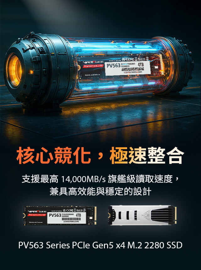 採用 PCIe Gen5 x4 與 NVMe 2.0 介面,Viper PV563 Series SSD 帶來最高 14,000 MB/s 讀取與 11,000 MB/s 寫入速度,並在功耗與效能之間取得出色平衡。結合 HMB 與 SLC 快取機制,讓你在遊戲、創作與多工處理中都能感受穩定且高速的回應效能。